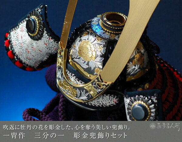 ■三分の一 彫金兜飾りセット 【送料無料】 品名 三分の一 彫金兜飾りセット(甲冑師、加藤一冑作品) 内容 兜、弓、太刀、屏風、飾り台、作札 天辺や鍬形台にいたるまで、細やかに牡丹の花が細工された優雅な兜。