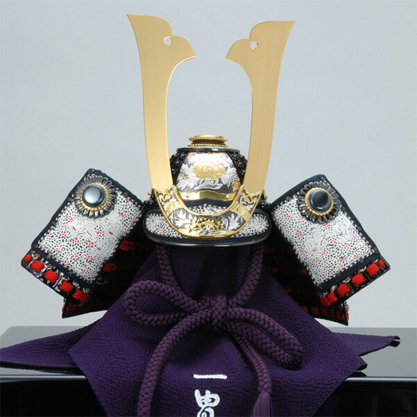 ■商品名 三分の一 彫金兜飾りセット ■内容 兜、弓、太刀、屏風、飾り台、作札 鍬形台や天辺に至るまで、あでやかに彫金が施されているので、 吹返と眉庇(まびさし)は、あえてシンプルに、意匠をあしらった鹿革を使用。