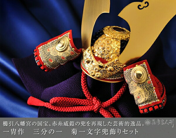 ■三分の一 菊一文字兜飾りセット 【送料無料】 品名 三分の一 菊一文字兜飾りセット(甲冑師、加藤一冑作品) 鍬形台には菊籬、菊の花々の中に、堂々漢字の「一」の文字を配しています。