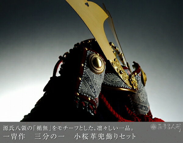 ■三分の一 小桜革兜飾りセット 【送料無料】 品名 三分の一 小桜革兜飾りセット(甲冑師、加藤一冑作品) 内容 兜、弓、太刀、屏風、飾り台、作札 最大の特徴、小桜革の威(おどし)。