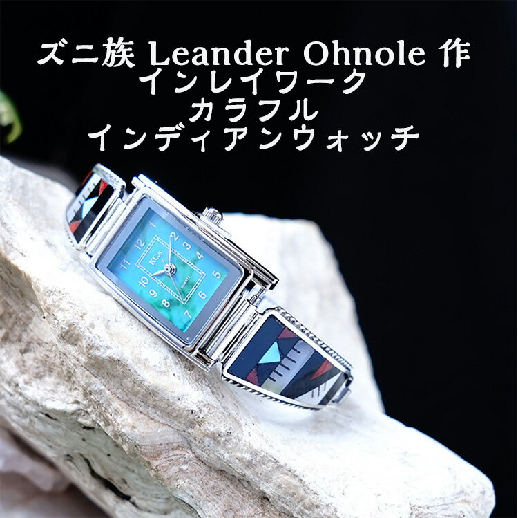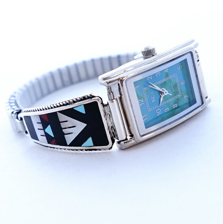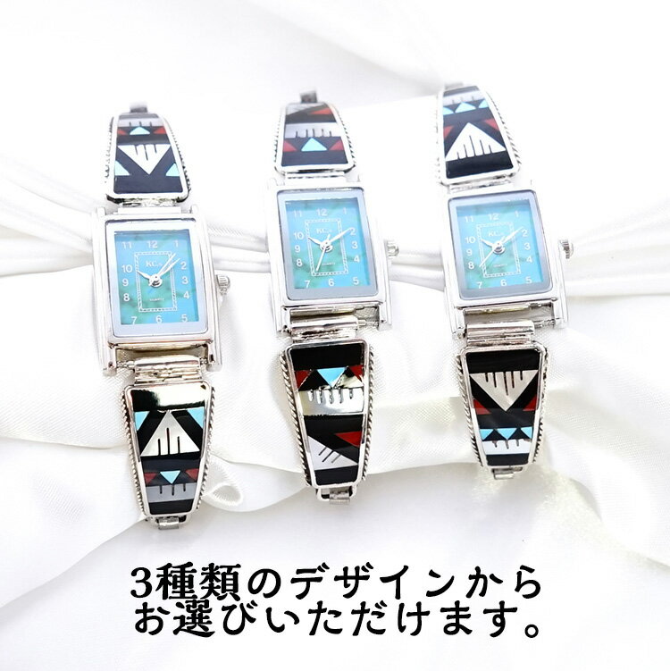 インディアンジュエリー バングル ウォッチ ズニ インレイワーク【アメリカ直輸入品 カラフル インディアンウォッチ】ターコイズ オニキス レッドコーラル シェル レディース お守り ネイティブアメリカン ネイティブアクセサリー 文字盤ウォッチ 腕時計