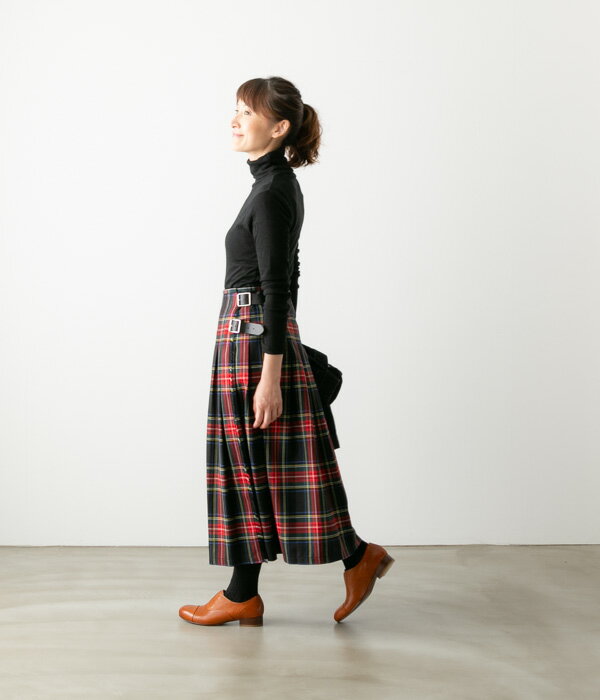 伝統的なタータンチェックのスカートが主役のコーデ。