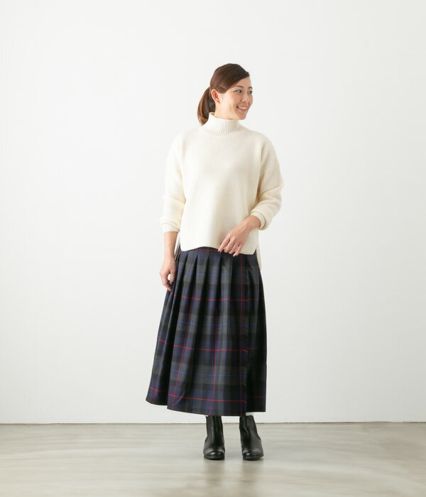 ブラックのタートルとタイツでスカートを最大限に引き立てています。