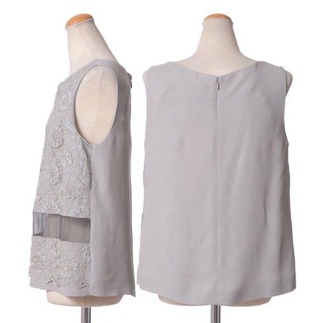美しいグレィッシュカラーをベース、センターにシフォンをプラスした凝ったデティールのブラウス。