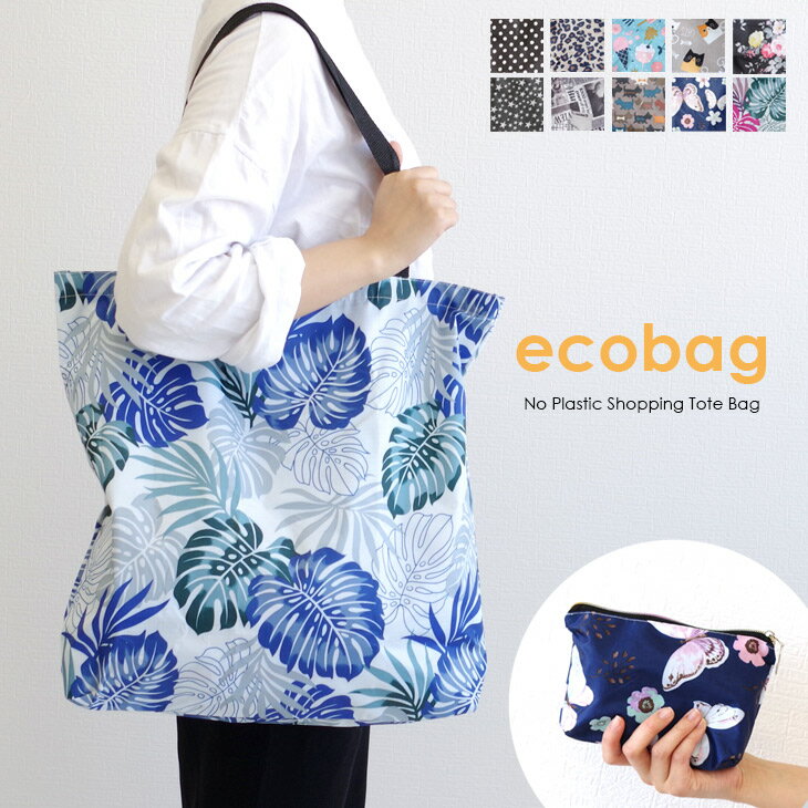 エコバッグ トートバッグ マイバッグ ブラック ドット レオパード ヒョウ柄 花柄 ねこ 犬 星 水玉 折りたたみ 折り畳み ショッピングバッグ チャック ファスナー 撥水 総柄 キャラクター コンパクト サブバッグ